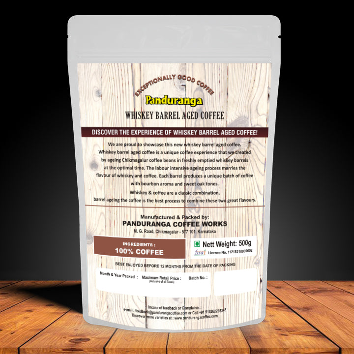 Whiskey barrel aged coffee is a unique coffee experience that we treated by ageing chikmagalur coffee beans in freshly empties whiskey barrel at the optimal time. The labour intensive ageing process marries the flavor of whiskey and coffee. Each barrel produces a unique batch of coffee with bourbon aroma and sweek oak tones. Whiskey and coffee are a classic combination. Barrel ageing the coffee is the best process to combine these two great flavours